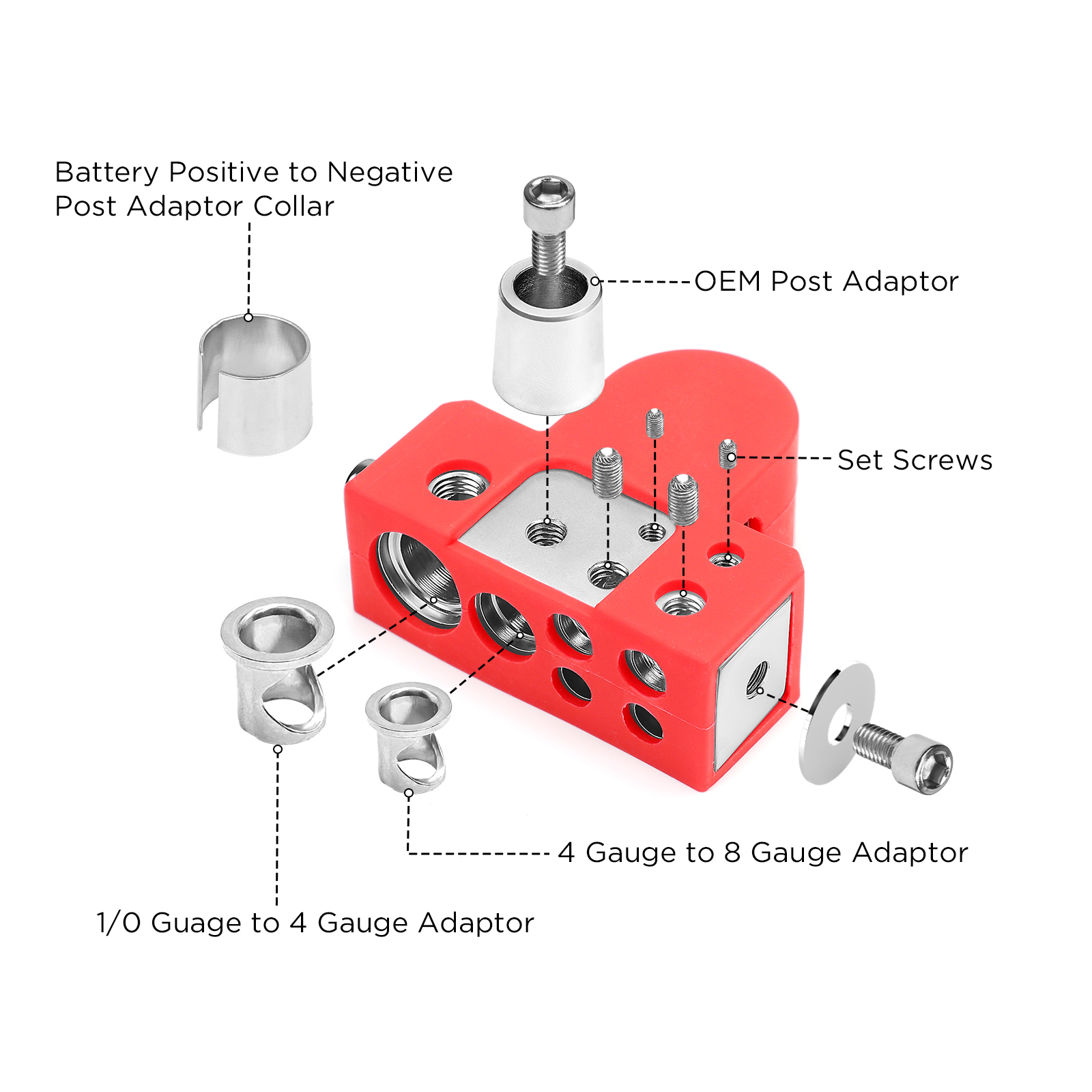 Cada terminal tiene conexión para: 1x 0/2/4 GA, 1x 4/8GA y 4x 8/10GA