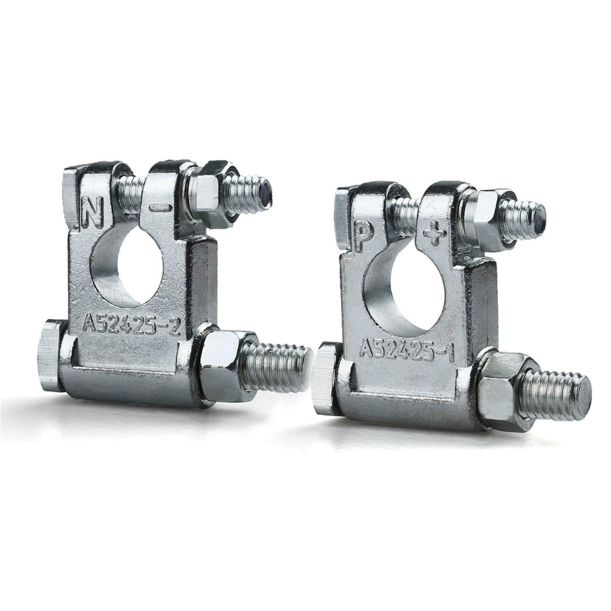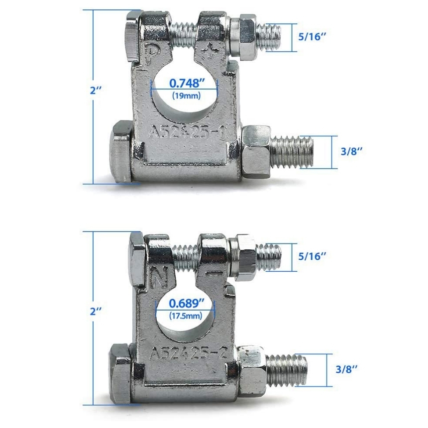 Se utilizan en automóviles, vehículos recreativos y embarcaciones con baterías de borne superior estándar 19mm cónico positivo y 17mm cónico negativo