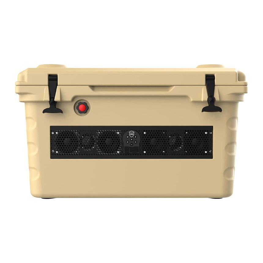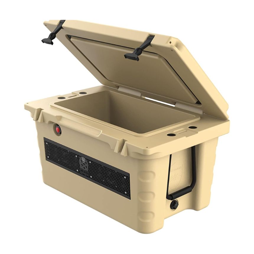Heladerita de camping con barra de sonido amplificada 200W 12V 8 horas de bateria 55 litros de capacidad IP67 Incluye cargador